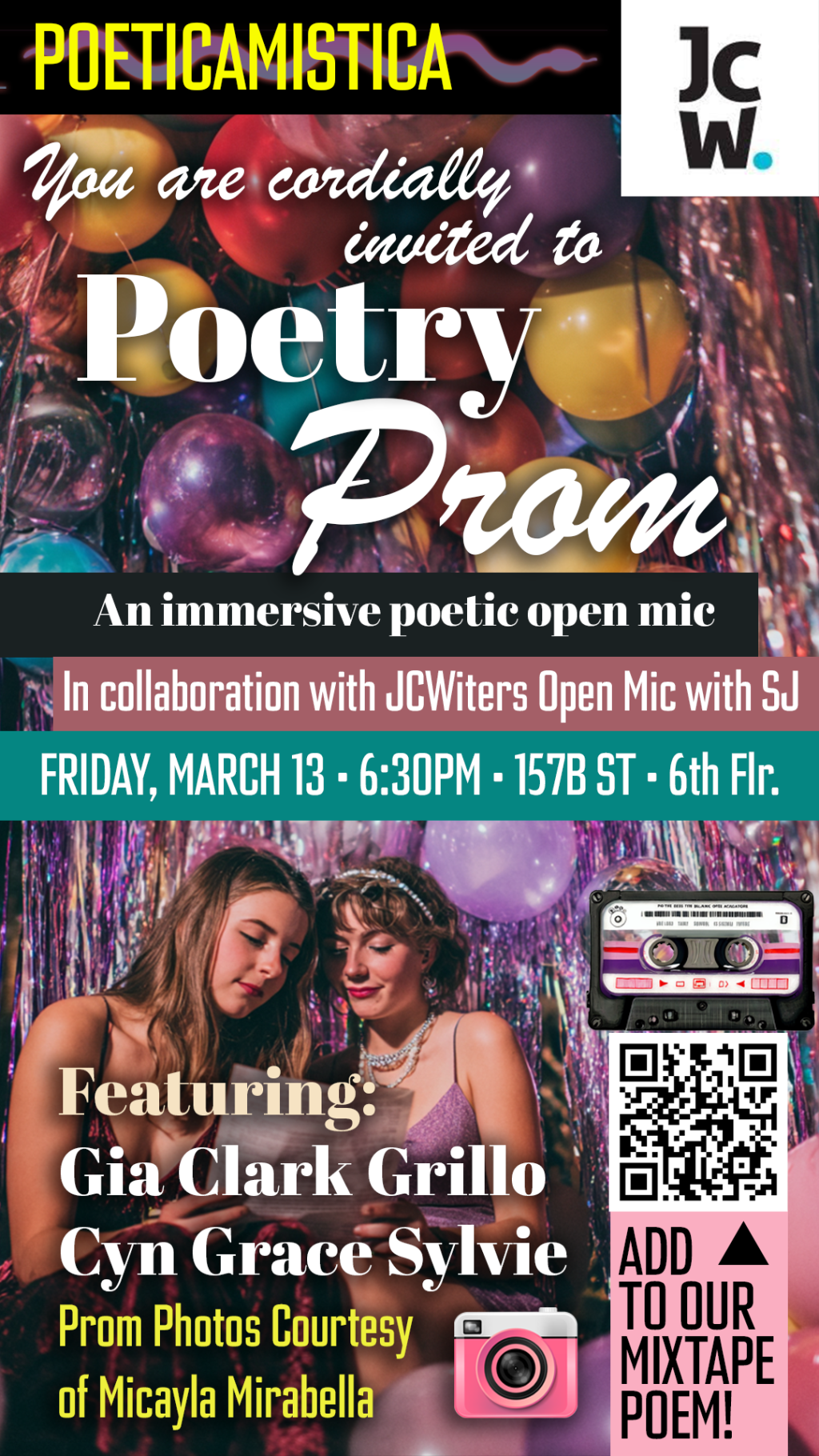 Held in collaboration with One Mic Stand with SJ (@sjbythegram) and Jersey City Writers (@jcwriters), Poetry Prom is an immersive poetic experience meant to invoke all the joy and nostalgia of Prom. Whether this is your first prom or you’re a prom hero, we invite you to attend as a guest, or take the prom stage at our open mic. We will also be celebrating the one-year anniversary of the One Mic Stand With SJ!
