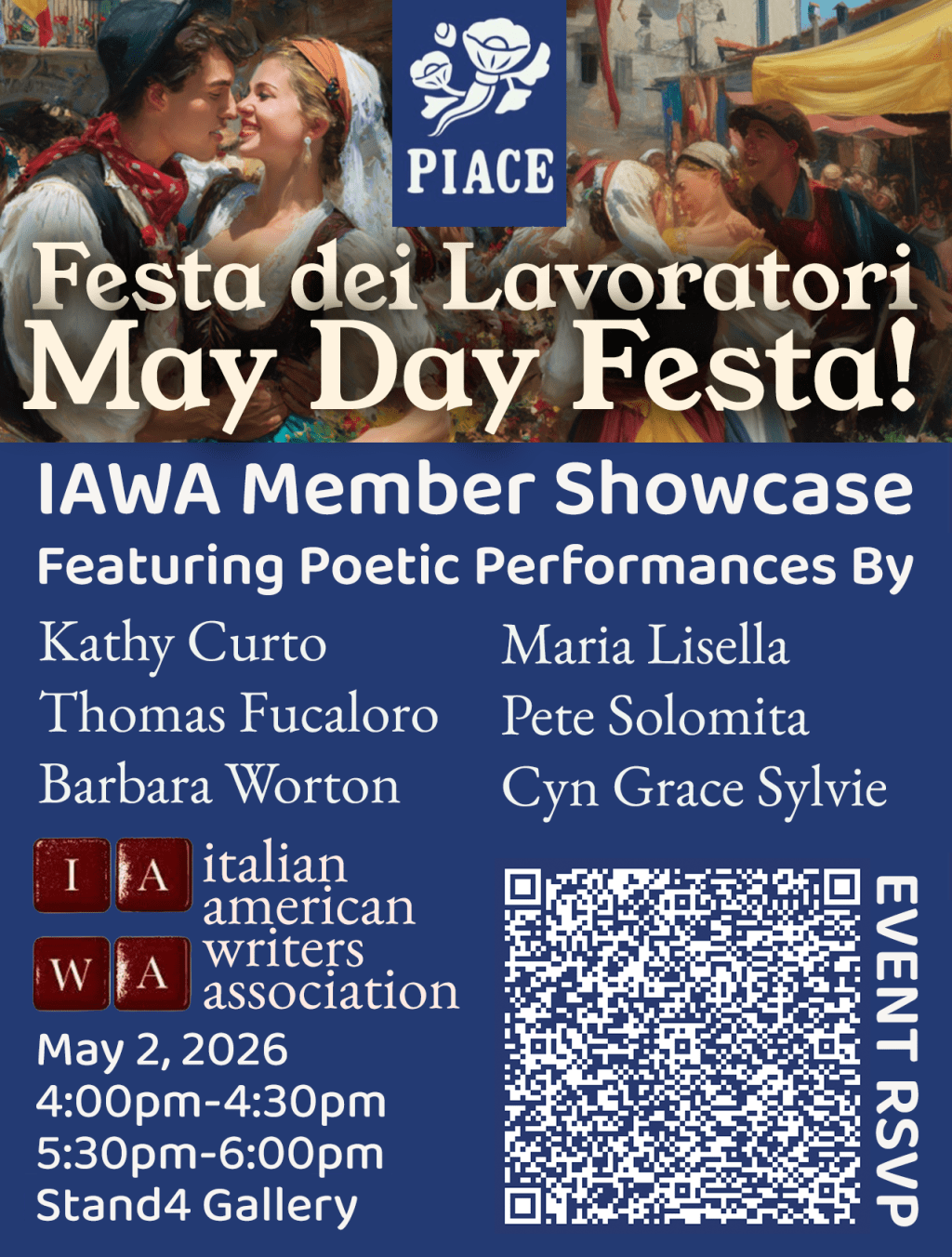 IAWA: The Italian American Writers Association is truly honored to be a part of PIACE: Progressive Italian-American Cultural Exchange’s inaugural May Day celebration at Stand4 Gallery in Bay Ridge, Brooklyn!