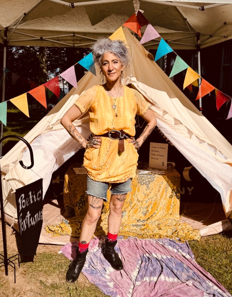 First premiered at the Poetry Society of New York’s New York City Poetry Fest (August 2025), Poetic Fortunes is a reinterpretation of the fortunetelling tents of yore, reimagined as an interactive collective poetic fortune system. Blending the arts of divination and poetry, a digital “crystal ball” becomes a repository for anonymous poetry. Participants experiencing the exhibit can then receive a fortune, and add their own fortune to the divination system.